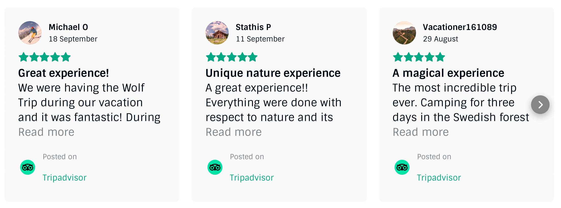 De hittar alltså vår sajt, men innan de bokar kollar de om vi har bra omdömen från tidigare gäster. De hittar omdömen om WildSweden på TripAdvisor, Google och Facebook, eftersom vi ber gäster skriva omdömen där.